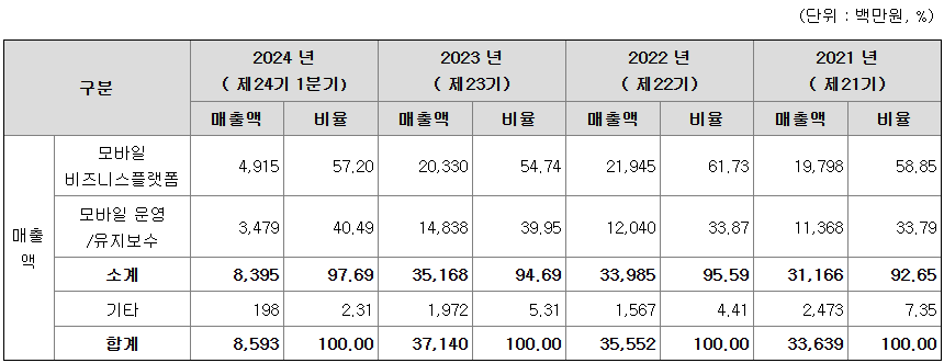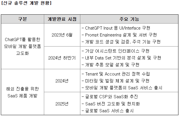 그 외에도 동사는 현재 보유하고 있는 모바일 비즈니스 플랫폼을 기반으로 초거대 AI 기능을 탑재한 제품과 클라우드 기반의 개발 운영 플랫폼 출시를 계획하고 있으며, 해외 진출을 위한 국내외 MSP와 CSP와 협력을 통해 SaaS 형태의 구독형 사업모델 개발 등의 신규사업으로 향후 매출 및 수익성 확대를 도모하고 있습니다.