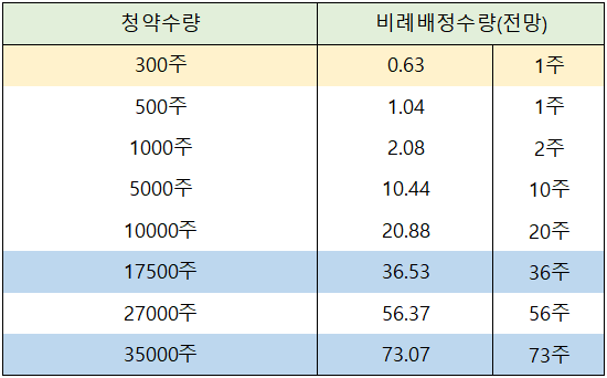 일반청약자의 최고 청약 한도인 17,500주까지 청약 신청한 경우에는 36주 배정이 예상되고, 우대등급의 최고 청약 한도인 35,000까지 풀 신청한 경우 73주 배정이 전망되고 있습니다.