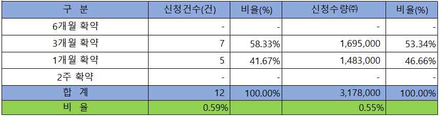 의무 보유 확약 건수는 12건에 3,178,000주로 전체 신청 물량 대비 건수로는 0.59%, 수량으로는 0.55%였으나, 신청 ㄱ수량이 적어 의미가 없어 보입니다.