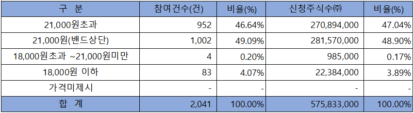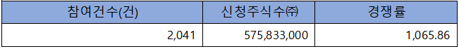 수요예측 참여 건수는 총 2,041건에 신청 주식수 575,833,000주로, 참여 경쟁률 1,065.86 : 1의 실적을 기록했습니다.