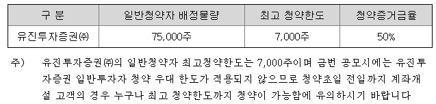 또한, 유진투자증권의 일반 청약자 배정 물량은 75,000주이고, 일반 청약자의 최고 청약 한도는 7,000주입니다.