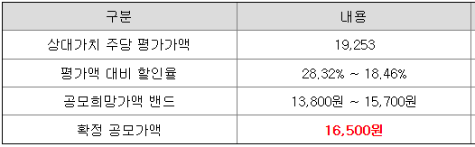 당초 희망 공모가격 상단 15,700원 대비 800원(5.10%) 상향 조정된 가격입니다.