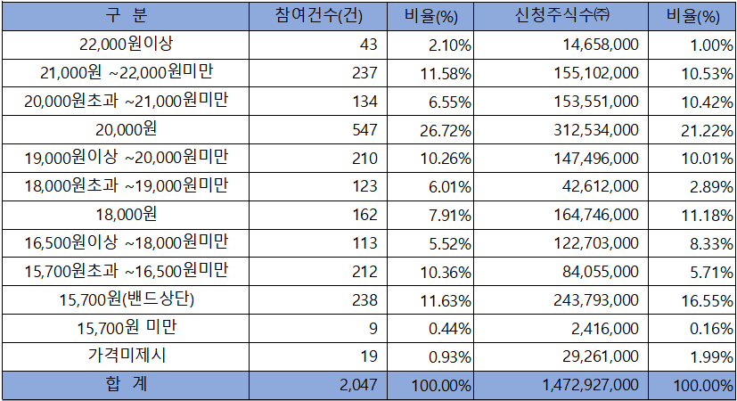 수요예측 참여 건수는 총 2,047건에 신청 주식수 1,472,927,000주로, 참여 경쟁률 870.20 : 1의 실적을 기록했습니다.