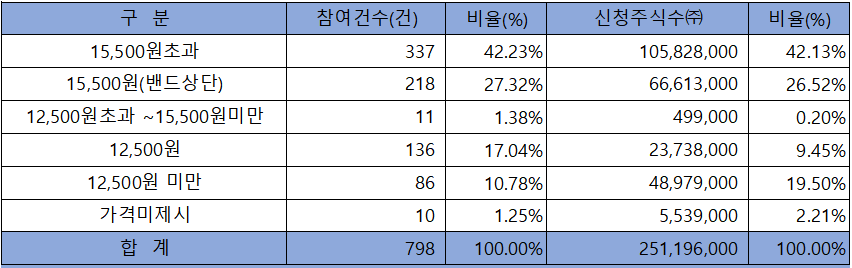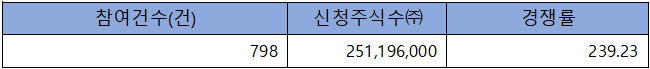 수요예측 참여 건수는 총 798건에 신청 주식수 251,196,000주로, 참여 경쟁률 239.23 : 1의 실적을 기록했습니다.