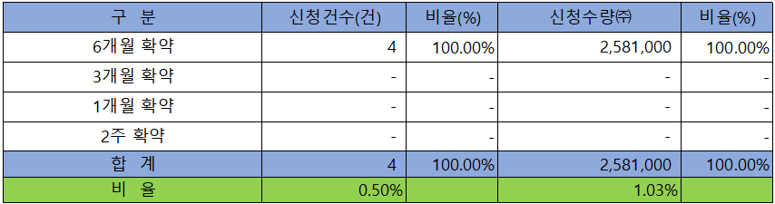 의무 보유 확약 건수는 4건에 2,581,000주로 전체 신청 물량 대비 건수로는 0.50%, 수량으로는 1.03%였으나, 신청 수량이 적어 의미가 없는 수치로 보입니다.