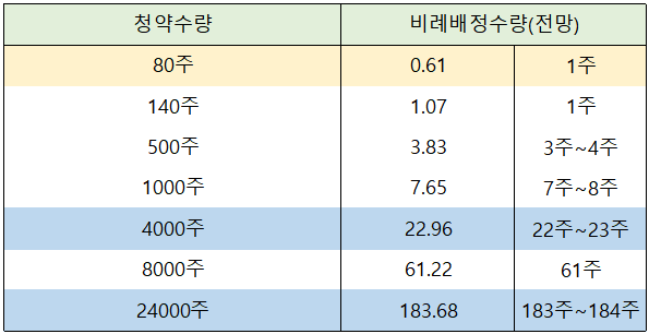 일반 청약자의 최고 청약 한도인 4,000주까지 신청한 경우에는 22주 ~ 23주 배정이 예상되고, 우대 등급의 최고 청약 한도인 24,000주 신청 시 183주 ~ 184주까지 배정이 예상되고 있습니다.
