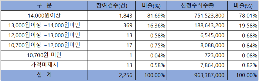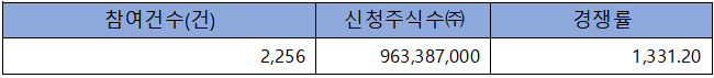 수요예측 참여 건수는 총 2,256건에 신청 주식수 963,387,000주로, 참여 경쟁률 1,331.20 : 1의 실적을 기록했습니다.