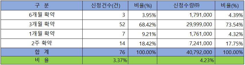 의무 보유 확약 건수는 76 건에 40,792,000주로 전체 신청 물량 대비 건수로는 3.37%, 수량으로는 4.23%였으며, 3개월 확약 비중이 제일 높았습니다.