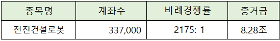 전진건설로봇의 청약에는 8.28조원의 증거금이 모이면서 2,175 : 1의 비례 경쟁률을 나타냈습니다.