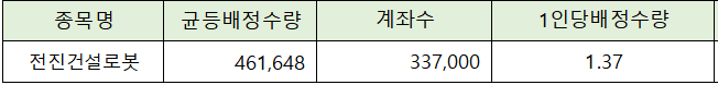 균등배정 은 총 337,000 계좌가 청약에 참가해 균등 배정 수량 461,648주를 감안하면 1인당 1.37주가 배정될 것으로 전망되고 있습니다.