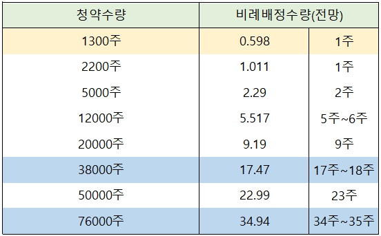 그다음 2,200주를 청약 신청한 경우 확실하게 1주를 받을 수 있고, 5,000주를 신청한 경우 2주를 배정받을 수 있을 것으로 전망되고 있습니다.