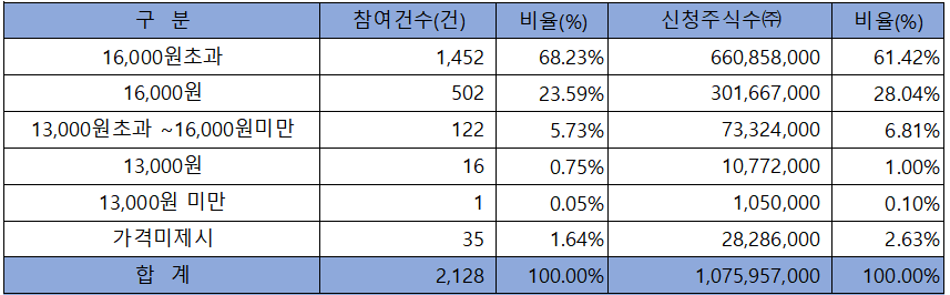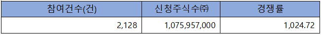 수요예측 참여 건수는 총 2,128건에 신청 주식수 1,075,957,000주로, 참여 경쟁률 1,024.72 : 1의 실적을 기록했습니다.