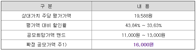 당초 희망 공모가격 상단 13,000원 대비 3,000원(23.08%) 상향 조정된 가격입니다.
