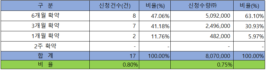 의무 보유 확약 건수는 17 건에 8,070,000주로 전체 신청 물량 대비 건수로는 0.80%, 수량으로는 0.75%였으며, 6개월 비중이 제일 높았으나, 경쟁률에 비해 의무보유 확약 건수가 적은 편이었습니다.
