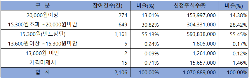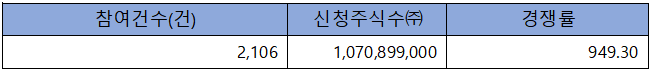 수요예측 참여 건수는 총 2,106건에 신청 주식수 1,070,899,000주로, 참여 경쟁률 949.30 : 1의 실적을 기록했습니다.