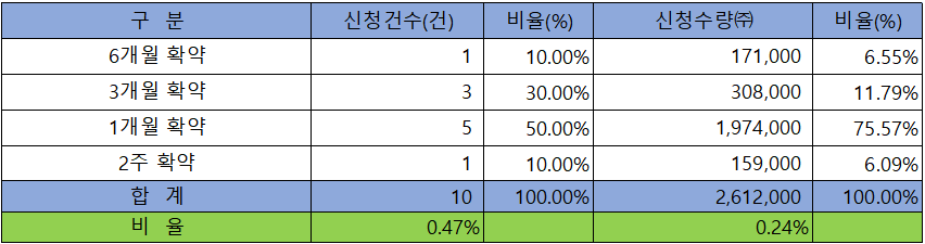 의무 보유 확약 건수는 10건에 2,612,000주로 전체 신청 물량 대비 건수로는 0.47%, 수량으로는 0.24%였으나, 신청 수량이 적어 의미가 크지 않다고 하겠습니다.