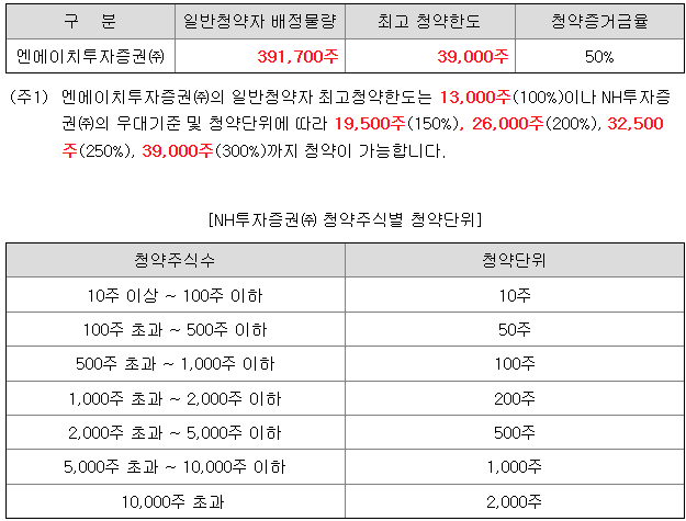 NH투자증권의 일반 청약자 배정 물량은 391,700주이고, 일반 청약자의 최고 청약 한도는 13,000주입니다.