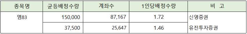 균등배정은 신영증권이 1.72주, 유진투자증권이 1.46주 배정이 예상되고 있어, 균등배정으로 1주 이상 2주까지 노려볼 수있을 전망입니다.