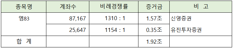 엠 83의 청약에는 증권사별로 신영증권의 경우 1.57조원, 유진투자증권의 경우 0.35조원의 증거금이 모이면서 합계 1.92조원이 증거금이 모였습니다.
