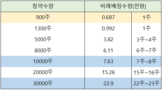 그다음 1,300주를 청약 신청한 경우 확실하게 1주를 받을 수 있고, 5,000주를 신청한 경우 3주 ~ 4 주를 배정받을 수 있을 것으로 전망되고 있습니다.