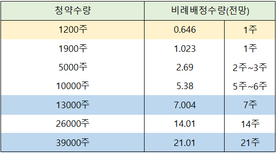 일반청약자의 최고 청약 한도인 13,000주까지 신청한 경우에는 7주 배정이 예상되며, 우대등급의 최고 청약 한도인 39,000주 신청시에는 21주 배정이 전망되고 있습니다.