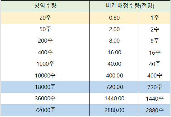 일반청약자의 최고 청약 한도인 18,000주까지 풀 청약 신청한 경우에는 무려 720주 배정이 예상됩니다.