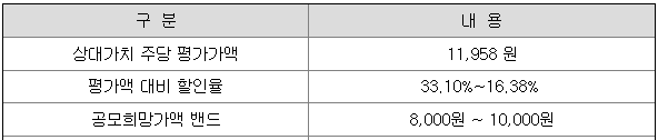 인스피언의 희망 공모가격은 회사의 주당 평가가액 11,958원에서 16.38% ~ 33.10% 할인한 가격입니다.
