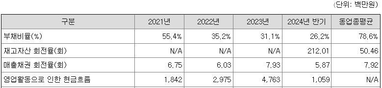 동사는 2024년 반기 기준 부채비율 26.2%로 2022년 동업종 평균을 하회합니다. 동사는 지속적으로 이익을 시현하고 있고, 이에 따라 자본총계가 꾸준히 증가함에 따라 부채비율이 점차 개선되고 있습니다
