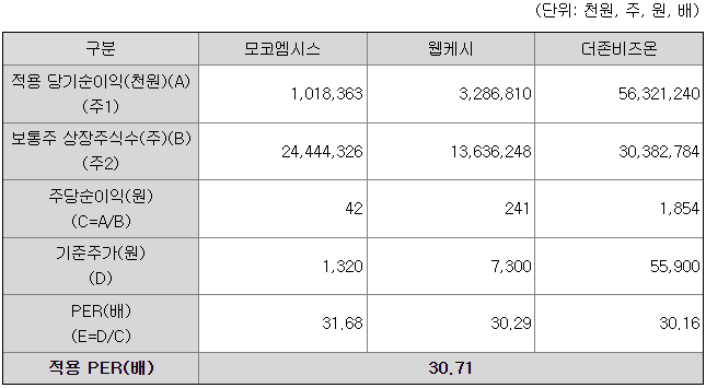 회사의 주당 평가가액은 2024년 반기 기준 직전 12개월의 순이익을 주식 수로 나누어 주당 순이익을 구하고, 여기에 유사회사의 평균 PER배수를 곱하여 산출한 것입니다.