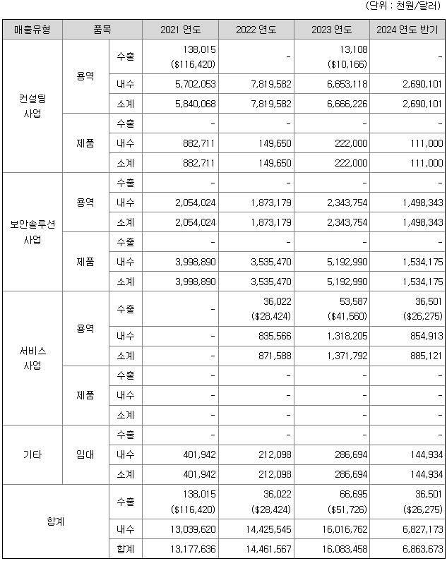 동사의 사업부문은 크게 컨설팅사업부, 솔루션사업부, 서비스사업부로 구분되며, 컨설팅사업부에서는 EAI 구축 및 운영유지보수 서비스 사업을, 솔루션사업부에서는 SAP 시스템 내 보안솔루션 사업을, 서비스사업부에서는 EDI SaaS 서비스 사업을 영위하고 있습니다.