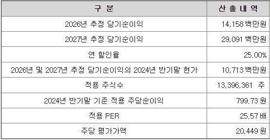 회사의 주당 평가가액은 2026년과 2027년의 추정 순이익을 할인하여 현재가치로 환산한 후, 주식수로 나누어 주당 순이익을 구하고, 여기에 유사회사의 평균 PER배수를 곱하여 산출한 것입니다.