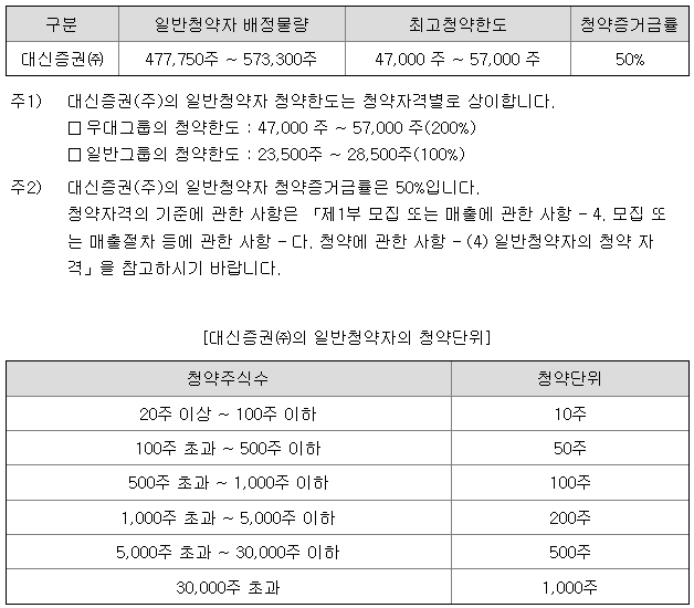 대신증권의 일반 청약자 배정 물량은 477,750주 ~ 573,300주이고, 일반 청약자의 최고 청약 한도는 일반그룹 기준 23,500주 ~ 28,500주입니다.