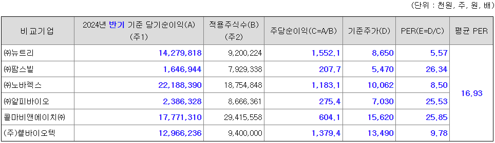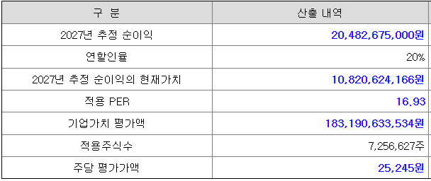 회사의 주당 평가가액은 2027년 추정 순이익을 할인하여 현재가치로 환산한 후, 유사회사의 평균 PER배수를 곱하여 회사가치를 정하고, 이를 주식수로 나누어 산출한 것입니다.