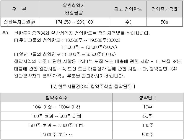 신한투자증권의 일반 청약자 배정 물량은 174,250주 ~ 209,100주이고, 일반 청약자의 최고 청약 한도는 5,500주 ~ 6,500주입니다.