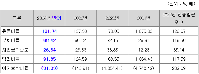 동사의 부채비율은 2021년 26.91%, 2022년 72.15%, 2023년 60.12%, 2024년 반기말 68.4%로 업종평균(116.56%) 대비 우위 수준을 기록하고 있습니다. 동사의 부채비율이 2021년 이후 증가한 사유는 2022년 중 동사의 신사옥 매입 중도금을 위한 대출 및 정책 자금 대출을 실행하였기 때문입니다. 2023년에는 50억원 유상증자로 자본 총계가 증가하여, 2024년 반기기준 부채비율 68.4%를 기록하였습니다.