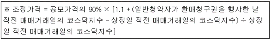 단, 환매청구권을 행사한 날 직전 매매거래일의 코스닥지수가 상장일 직전 매매거래일의 코스닥지수에 비하여 10%를 초과하여 하락한 경우에는 다음 산식에 의하여 산출한 조정가격을 권리행사가격으로 합니다.