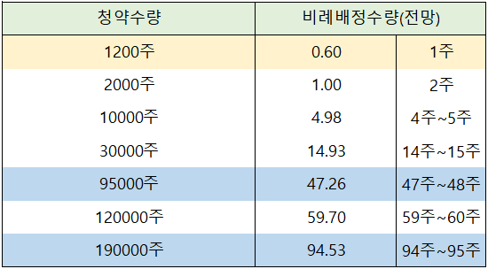 일반청약자의 최고 청약 한도인 95,000주까지 청약 신청한 경우에는 47주 ~ 48주 배정이 예상되며, 우대등급 치고 청약 한도인 190,000주 신청 시에는 94주 ~ 95주 청약이 전망되고 있습니다.