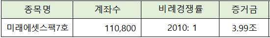 미래에셋 스팩 7호의 청약에는 3.99조원의 증거금이 모이면서 2,010 : 1의 비교적 높은 비례 경쟁률을 나타냈습니다.