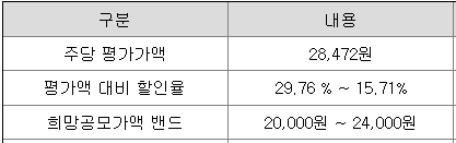 씨메스의 희망 공모가격은 회사의 주당 평가가액 28,472원에서 15.71% ~ 29.76 % 할인한 가격입니다.