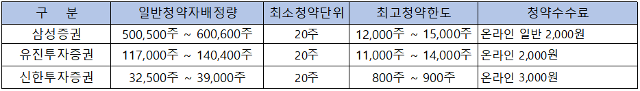 - 청약 가능 증권사 : 삼성증권, 유진투자증권, 유안타증권