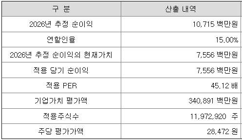 회사의 주당 평가가액은 2026년 추정 순이익을 할인하여 현재가치로 환산한 후, 유사회사의 평균 PER배수를 곱하여 회사가치를 정하고, 이를 주식 수로 나누어 산출한 것입니다.