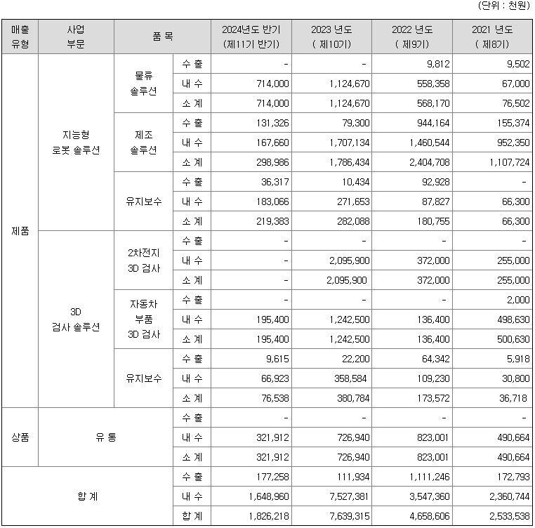 당사의 지능형 로봇 제조솔루션과 물류솔루션 모두 고객사 현장에서 양산 검증이 완료되었으며, 고객사 내 수평 전개 및 다양한 고객사로의 판매 확대로 매출의 본격적인 성장을 기대하고 있습니다.