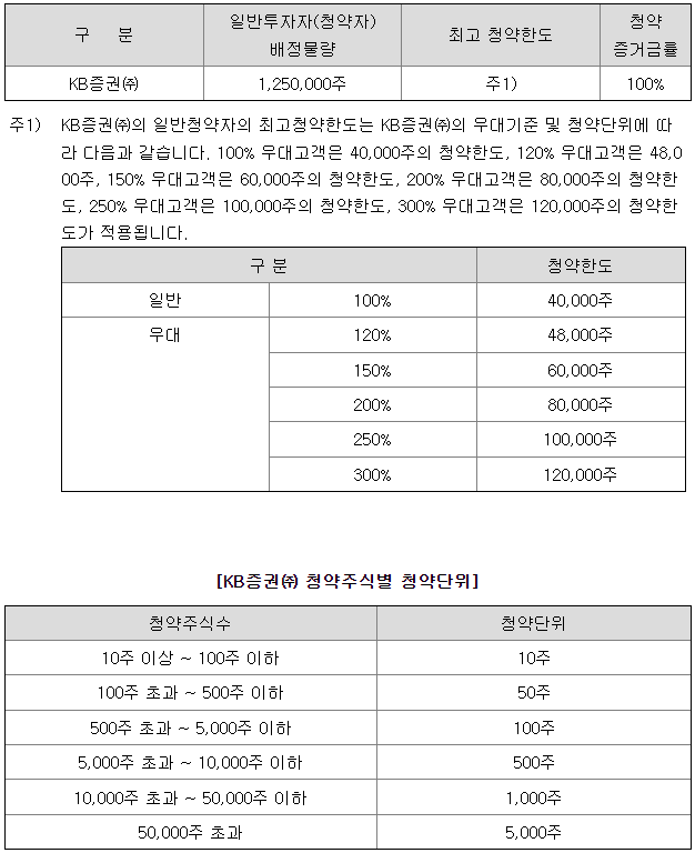 KB증권의 일반청약자 배정은 1,250,000주이고, 일반 청약자의 최고 청약 한도는 일반 고객 기준 40,000주입니다.