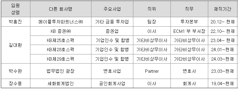 동사는 메이플투자파트너 박홍진팀장과 KB증권의 길대환이사가 임원을 담당하는 등 투자 업계 전문가들로 경영진을 구성하고 있습니다.