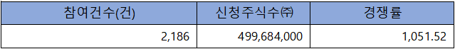 수요예측 참여 건수는 총 2,186건에 신청 주식수 499,684,000주로, 참여 경쟁률 1,051.52 : 1의 실적을 기록하였습니다.
