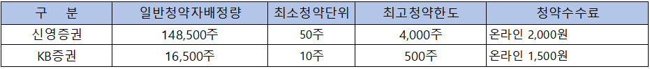 청약 가능 증권사별 최소 청약 단위, 일반 청약자 배정 물량, 일반 청약자 최고 청약 한도와 청약 수수료는 아래 표와 같습니다.