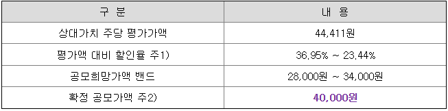 당초 희망 가격 상단 34,000원 대비 6,000원 (17.65%) 상향 조정된 가격입니다.