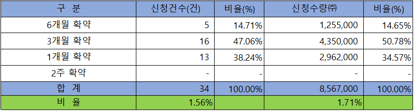 의무 보유 확약 건수는  34건에 8,567,000주로 전체 신청 물량 대비 건수로는 1.56%, 수량으로는 1.71%였으며, 3개월 신청 비중이 제일 높았습니다만, 신청 주식 수가 적어 큰 의미는 없다고 하겠습니다.