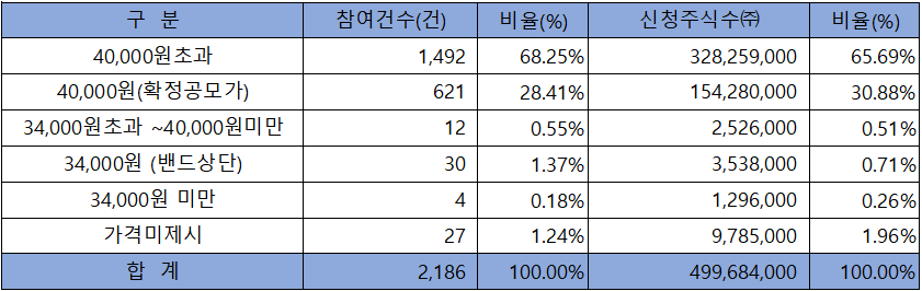 희망 공모가격 상단 이상 신청 비율은 97.78%였으며, 확정 공모가 40,000원 이상 신청 비율도 96.57%, 40,000원 초과 비율이 65.69%에 달했습니다.