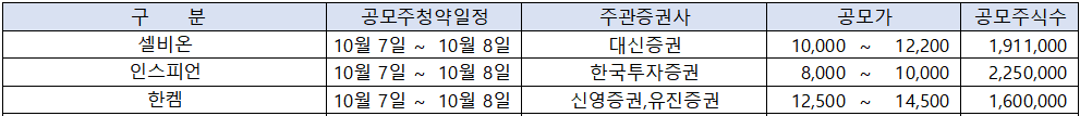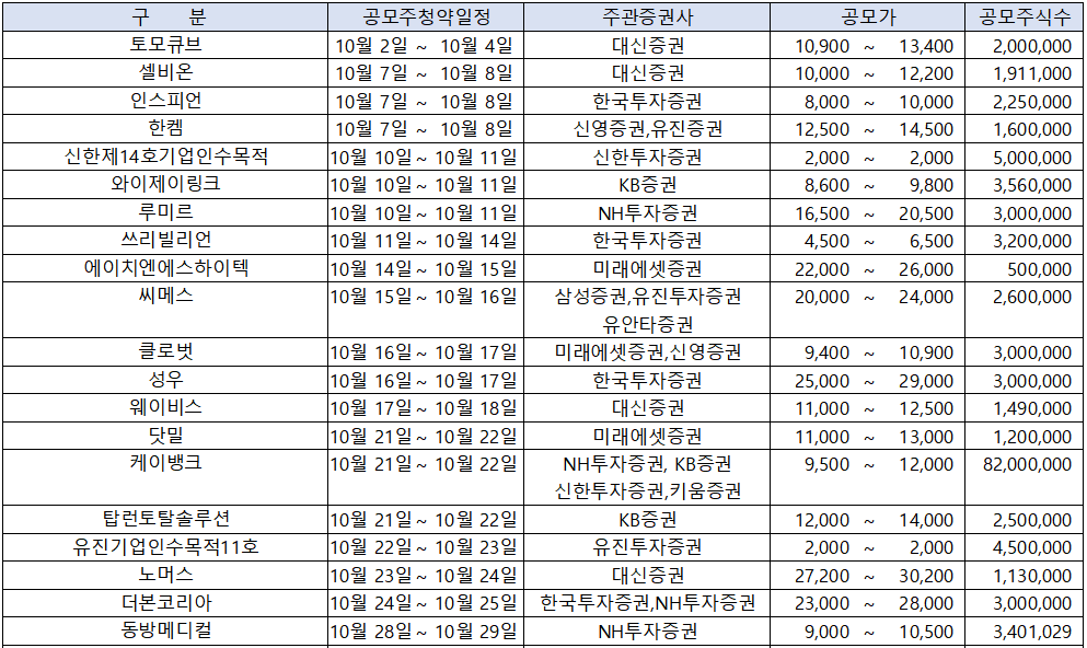 요즘 공모주 심사 과정이 까다로워지면서 청약 일정이 뒤로 밀리는 경우가 꽤 있는 것을 감안하더라도, 10월 공모주 청약 일정은 역대급이라고 할 수 있겠습니다.